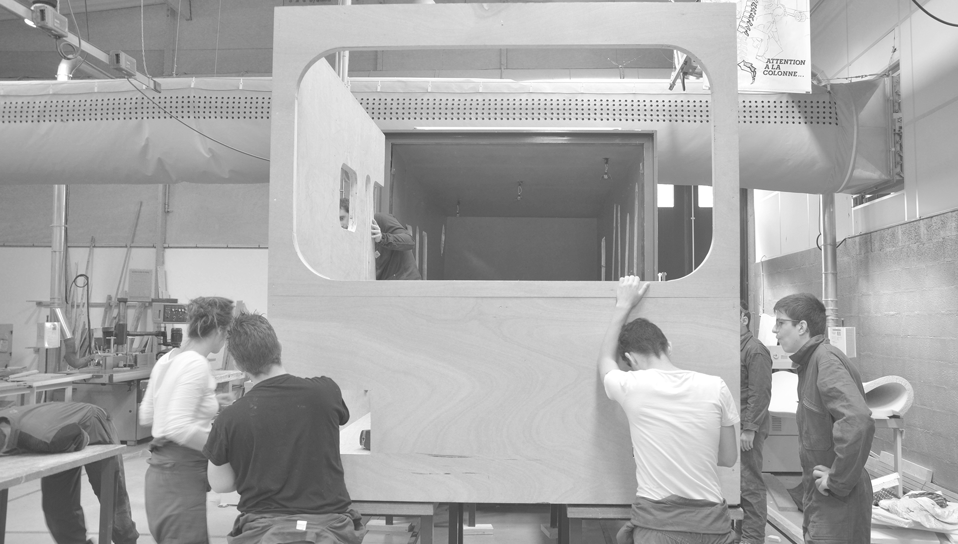 Всё закончилось, все фестивали, вся техника, все бараны и собаки, лающие вокруг моего остова - всё кончилось. А затем я понял, что закончились и переделки. Я уезжаю, сменяя грунтовый пол темного сарая на полированное бетонное покрытие и неоновую подсветку практически стерильного ателье Профессионального Лицея Брионна. Между тем Неизвестный Масштаб, кажется, поняли, что я стою дорого и нуждаюсь в особом внимании. В команде появляется новый член команды - архитектор. Теперь он берётся за меня. Я становлюсь для него сложнейшим вызовом, отравленным подарком. В течение учебного года работу надо мной должны закончить, сделать меня окончательно кочевым и, как они надеются, способным на демонстрации. Моё тело делают телескопическим: ради дополнительных квадратных метров, ради того, чтобы сделать меня похожим на кочевой трейлер, и, конечно же, чтобы удовлетворить эго того, кто изначально разрабатывал мой проект. Содержание дискуссий вокруг меня меняется: теперь говорят о телескопических рельсах, о нагрузке, об особенностях сборки деревянных изделий. Мои эскизы, раньше делавшиеся на коленке, теперь разрабатываются в программах САО. Для меня продумали и создали раздвигающийся корпус, в котором запланировали ателье и экран для показов фильмов на свежем воздухе, своего рода гибрид ящика и винтажного телевизора. Студенты и профессора столярного дела начинают свою работу среди опилок, под шум работающей ленточной пилы, рубанков, фрезы. Довольно забавно, что к работе подключился один из путешественников. Теперь уже профессора с подозрением относятся к его неортодоксальным столярным решениям. Мой раздвижной корпус оборудован скамейками, в которых находится место для хранения всего необходимого, здесь же размещены наружные динамики, встроены различные разъемы, позволяющие устраивать показы и подключать компьютеры ателье. Центральный стол на гидроцилиндрах опускается до уровня сидений, образуя большую кровать (во мне можно и поспать). Грузовик, жильё, ателье, кинозал.