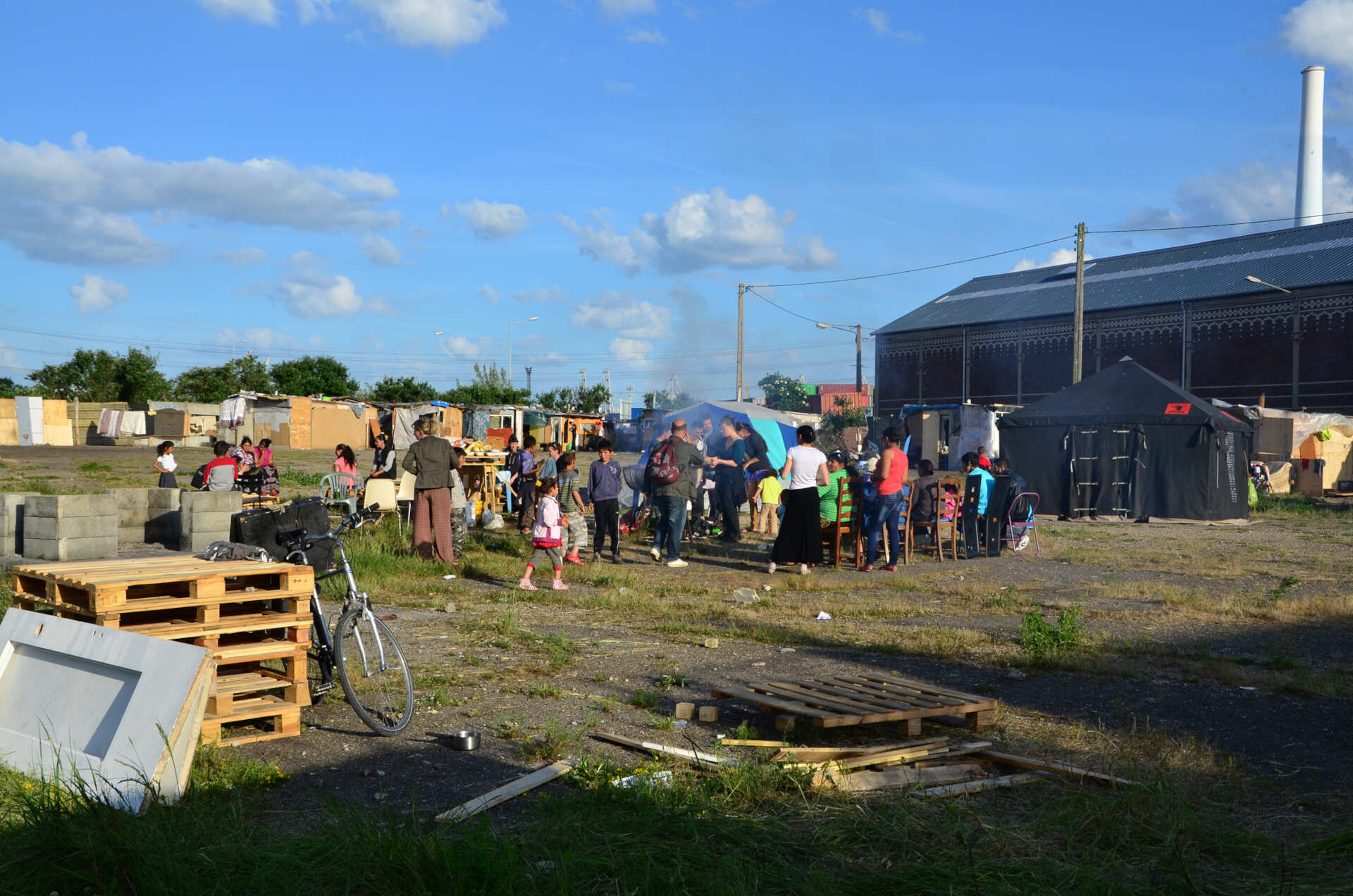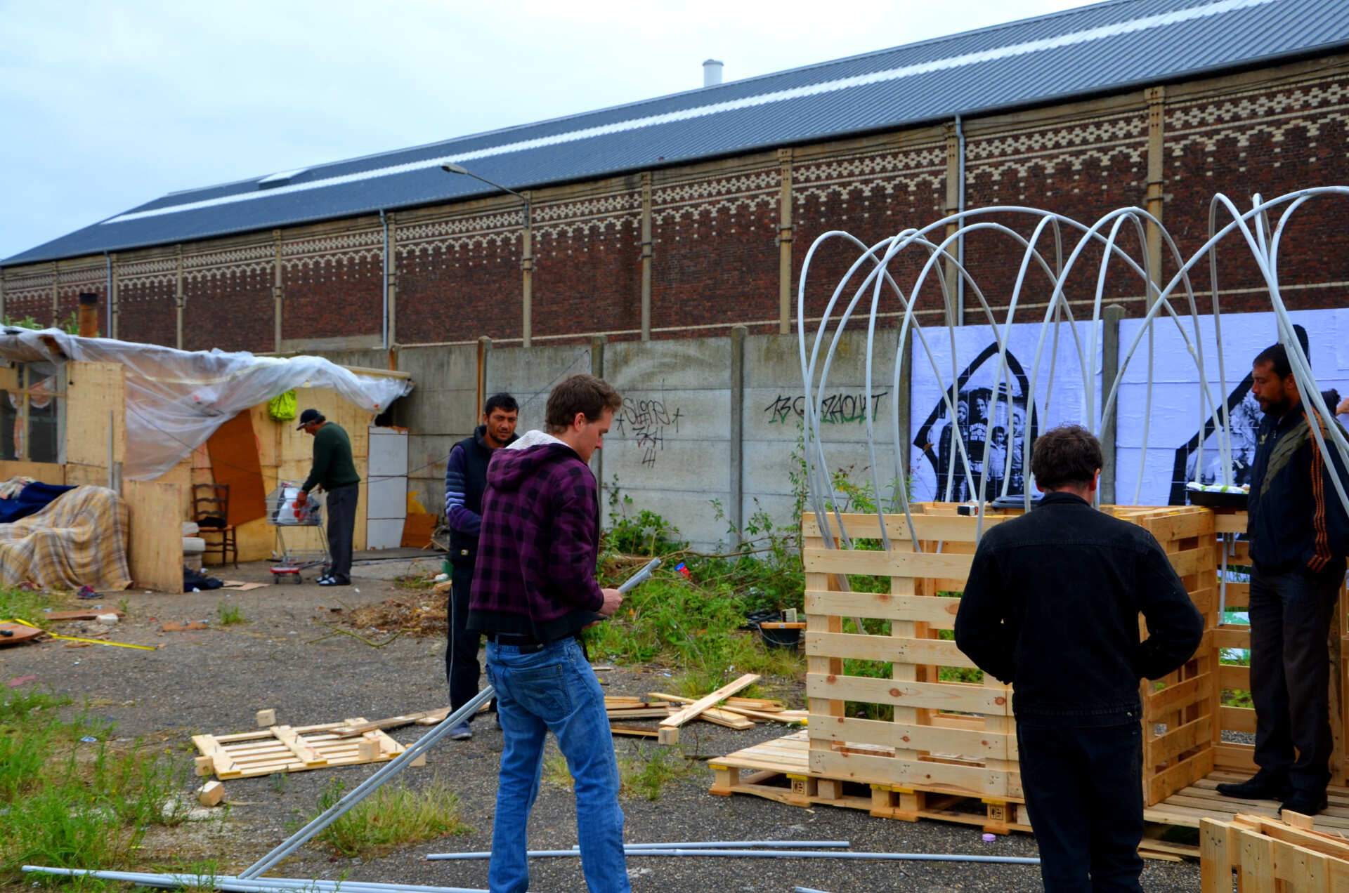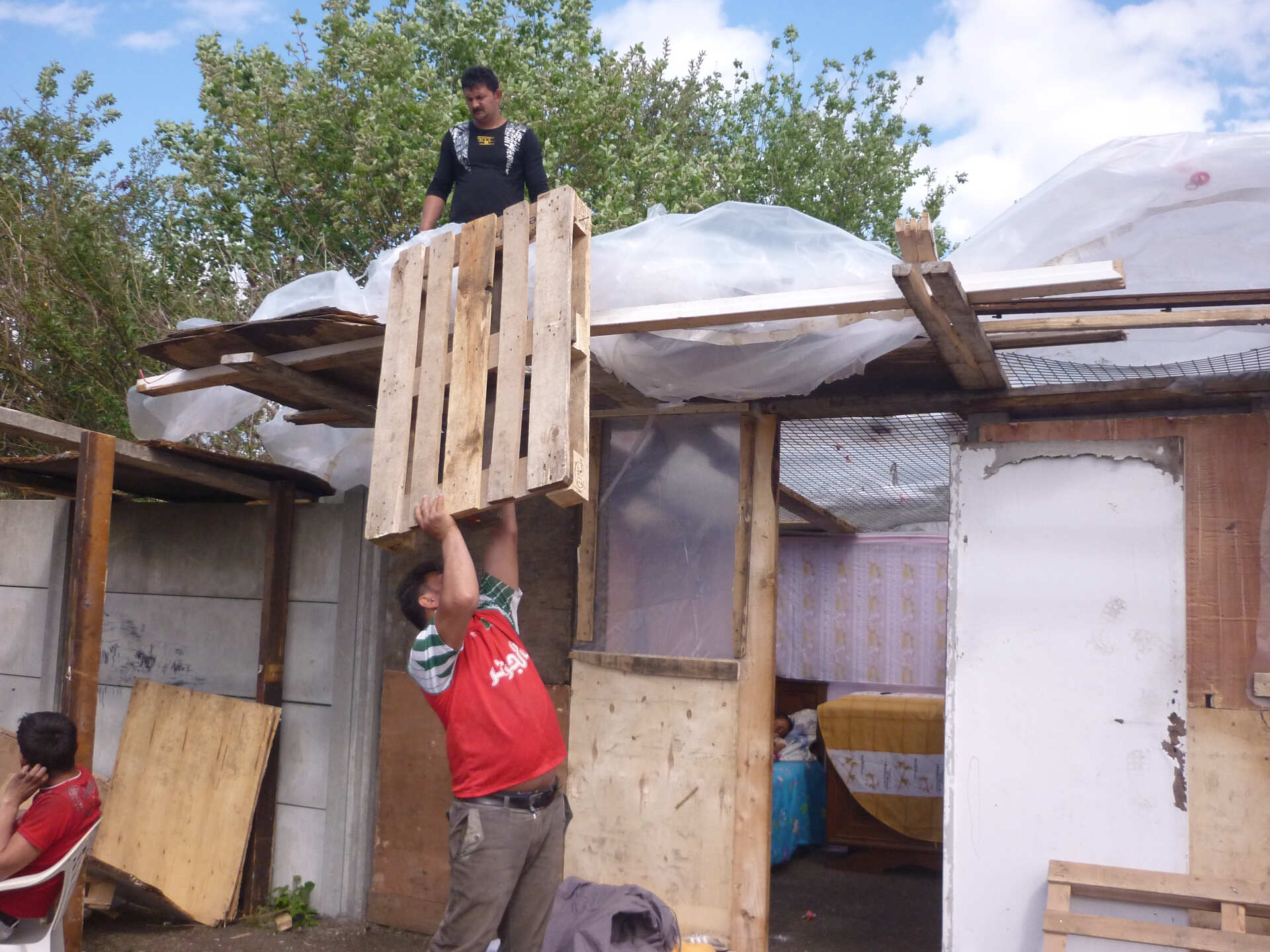 Ironie grinçante, par quelques mots et gestes, il explique qu'en Roumanie il travaillait dans une usine de palettes. Celles qu'il dépointe ici pour aménager et assainir la précarité sont-elles de celles qu'il a monté là-bas ? À l'autre bout de l'Europe ? Auquel cas le voyage de ces pièces de bois semble bien plus léger que celui des hommes.