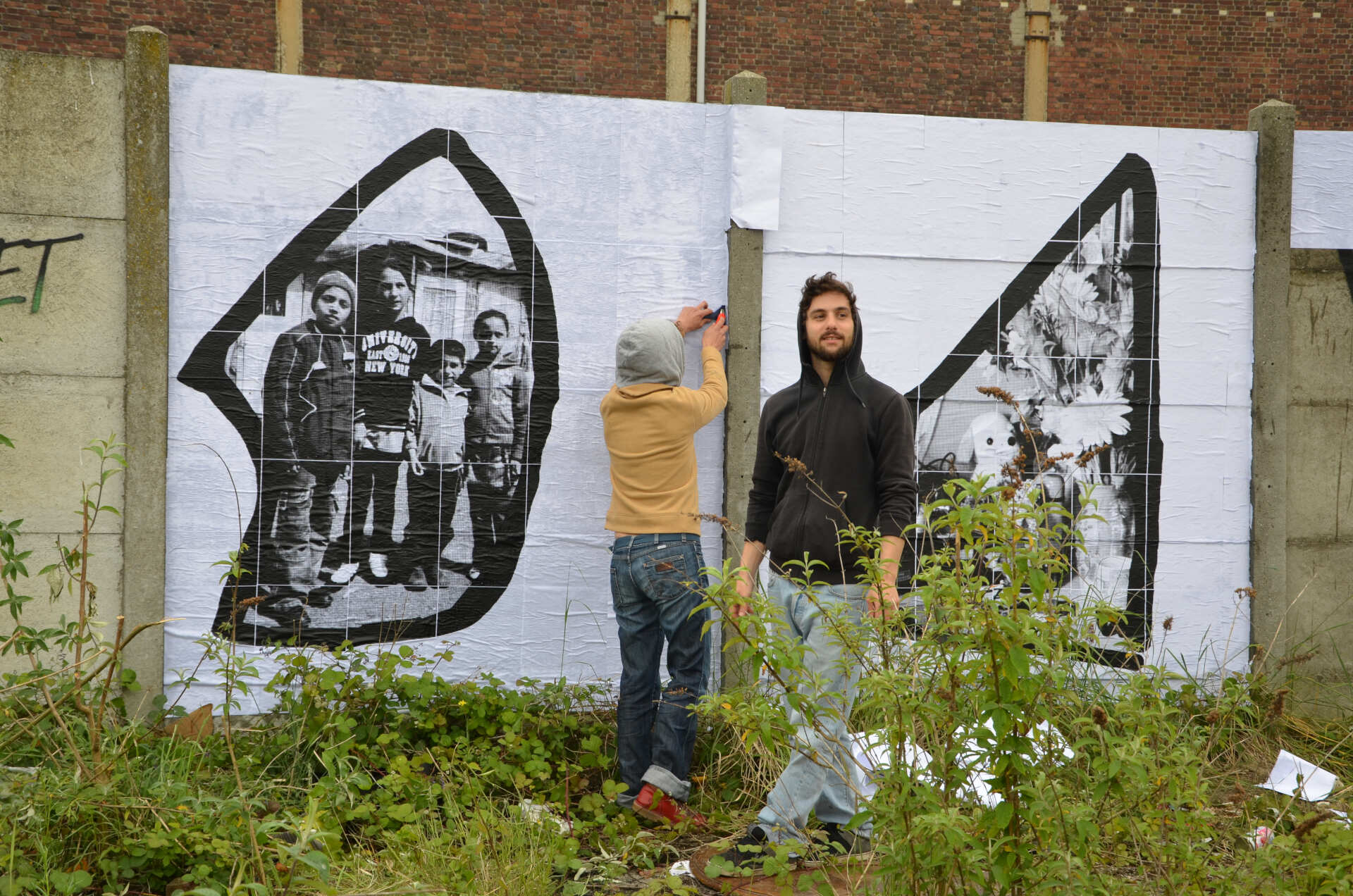 Des bénévoles nous ont rejoint et prêtent la main à l'installation des affiches sur le mur d'enceinte. Nous désirions les poser à l'extérieur comme une vitrine de la "normalité" d'ici, mais les pressions policières et les menaces font que personne ne veut se voir affiché au grand jour. Nous restons alors pour l'instant de ce côté du mur, frontière intérieure, provisoire et instable de ces Européens non autorisés à circuler librement ; nouvelle enclave dans ce Havre qui a vu le port quitter ses murs pour se réfugier derrière des grilles sensées protéger le commerce maritime de container, de possibles infiltrations terroristes, à moins qu'il ne s'agisse d'une nouvelle frontière cantonnant les marins extra européens hors sol.