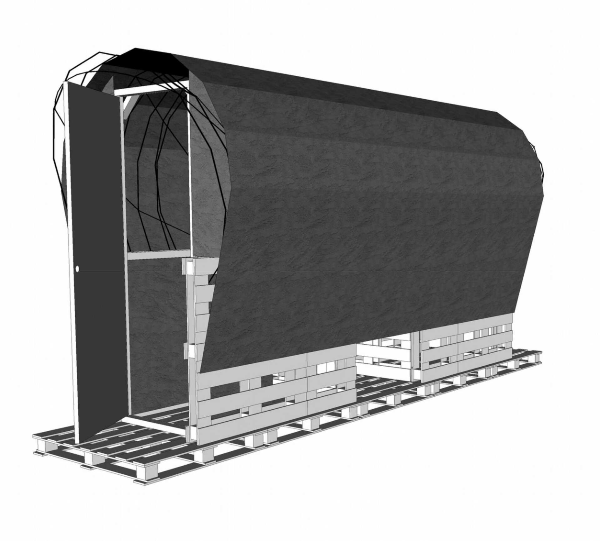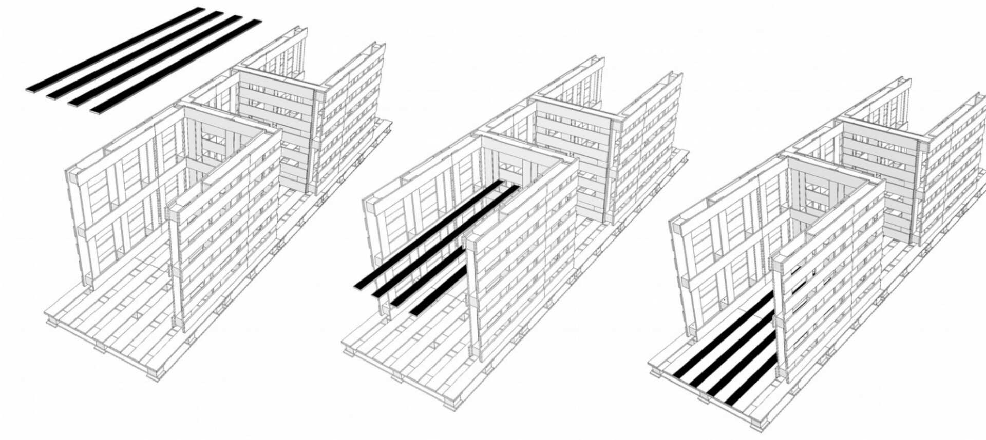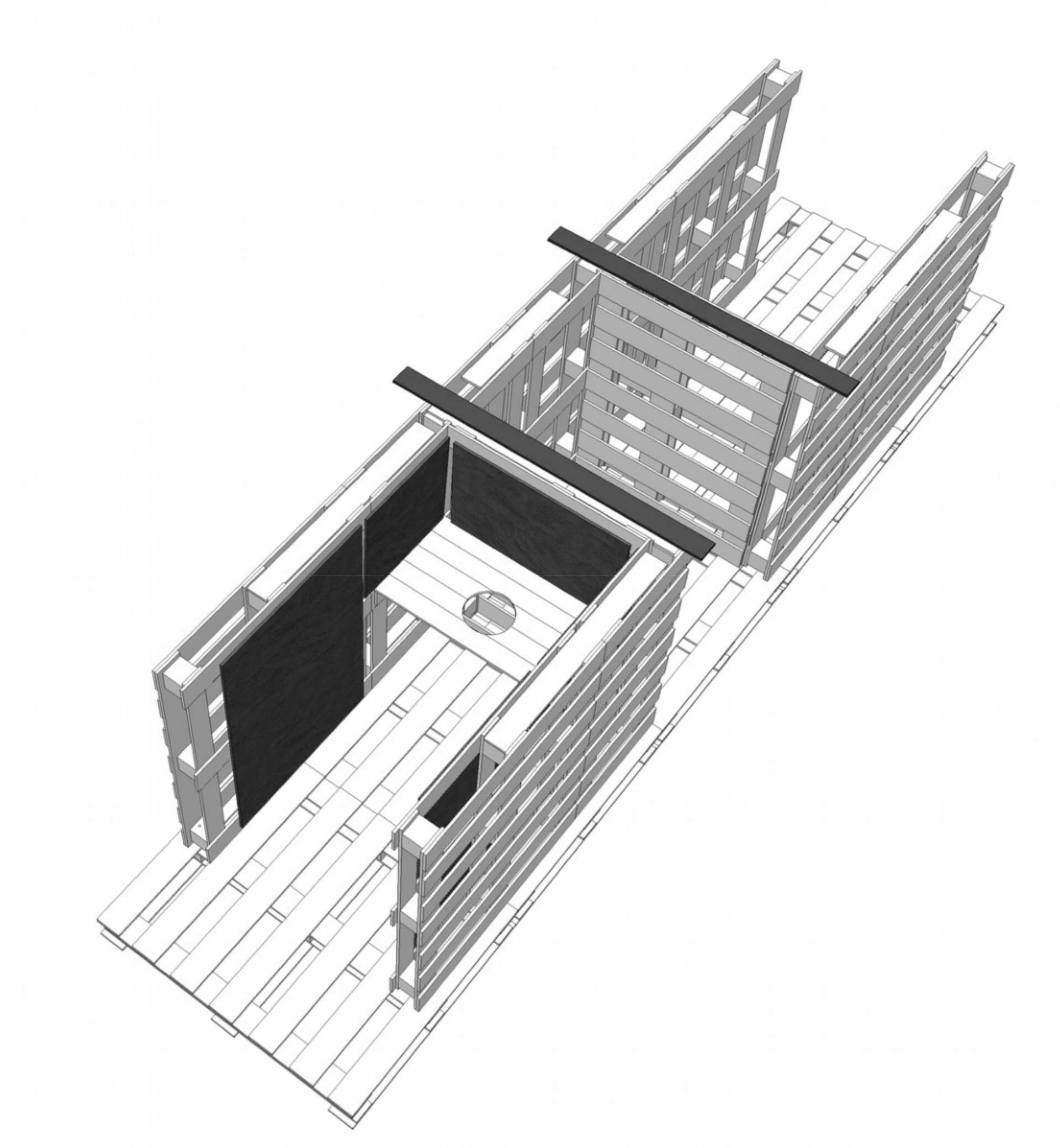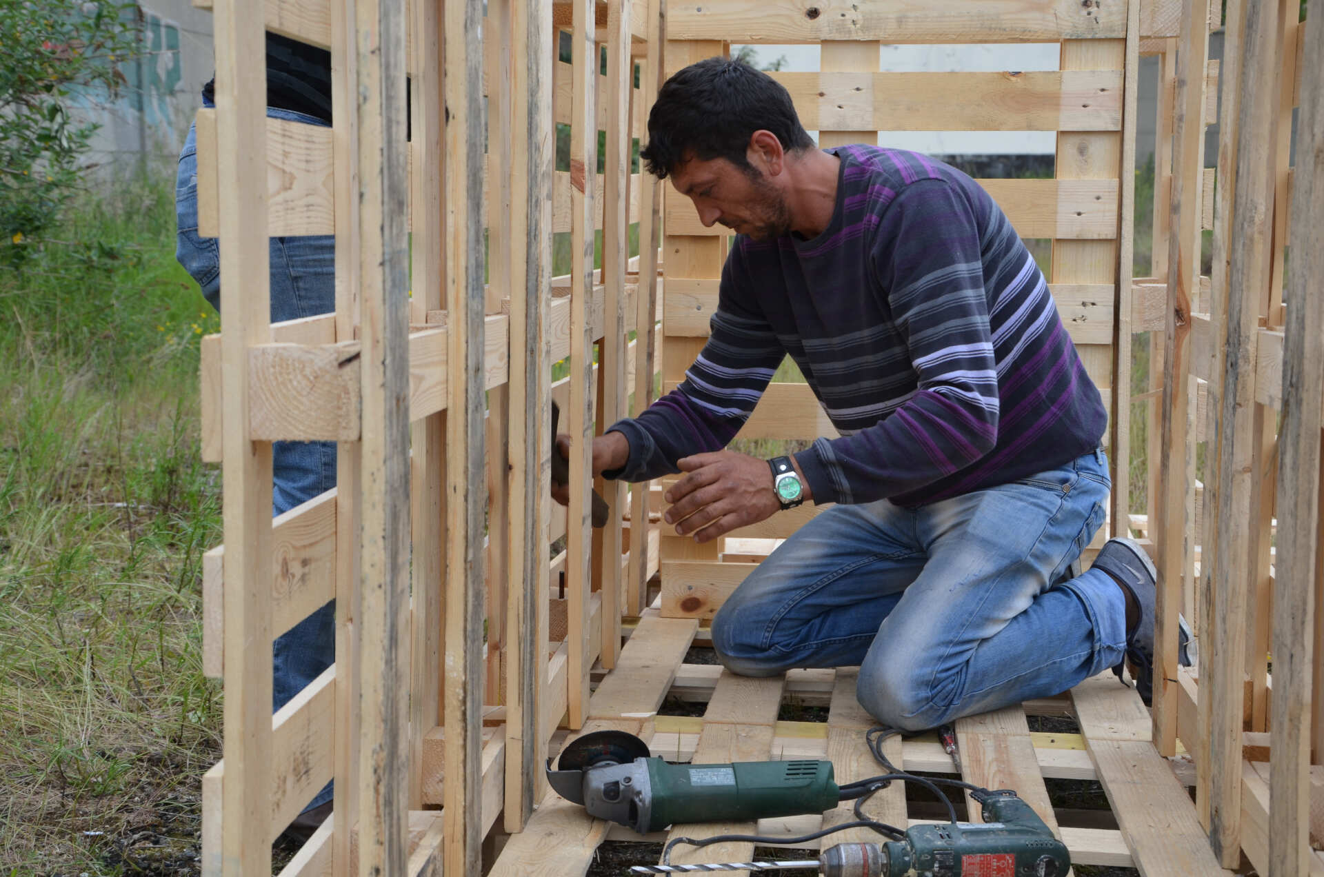 Le groupe électrogène posé, les outils sortis, Ioan et Christi s'activent. Nous confirmons ensemble l'emplacement du premier bloc sanitaire. Posons les premières palettes qui servirons de plancher. S'en suit une longue discussion autour du mode d'assemblage. Nous proposons de joindre les palettes à l'aide d'un système de mortaises et d’agrafes en fer à béton afin de rendre plus aisé le démontage en cas d'expulsion. Ils y croient visiblement peu et préfèreraient pointer l'ensemble comme il le font pour leurs baraques.