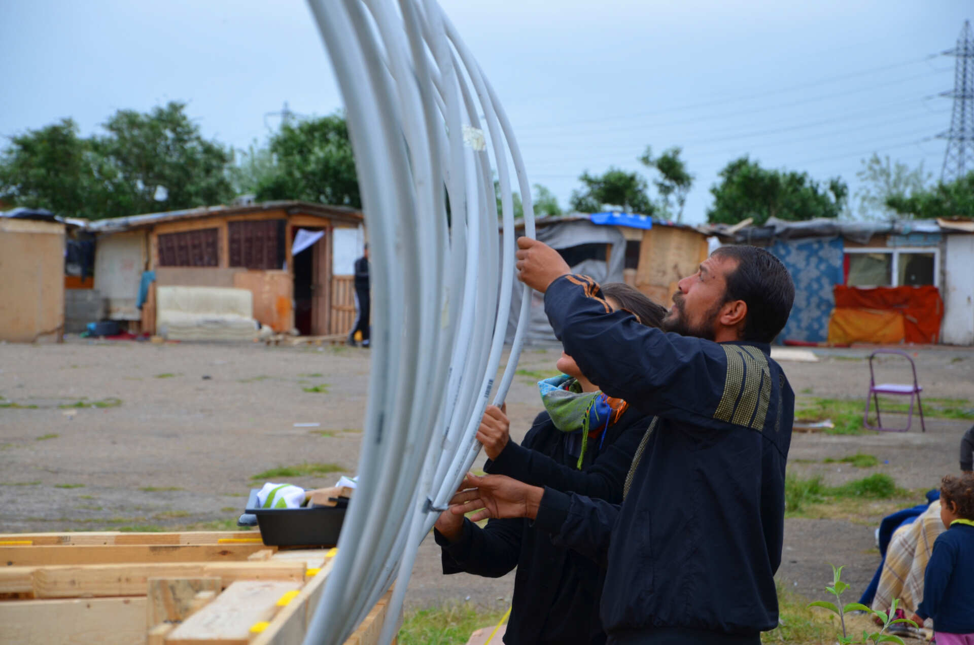 Depuis le milieu de l'après-midi, les membres du comité de soutien arrivent peu à peu avec brasero, boissons et nourriture, solidarité, pour eux, usuelle. Il y en eu d'autres, pendant ce chantier, de la voisine qui offre l'électricité et nous laisse tirer une improbable ligne de chez elle à notre enclave coupée de tous réseaux, à cette entreprise et ses salariés offrant et aidant à charger les palettes dans notre camion, en passant par ce menuisier qui fournit à discrétion la sciure de bois nécessaire au fonctionnement des toilettes que Madalin apporte en grands sacs jusqu'ici, ou les nombreux traducteurs qui se sont proposés pour traduire bénévolement le film.