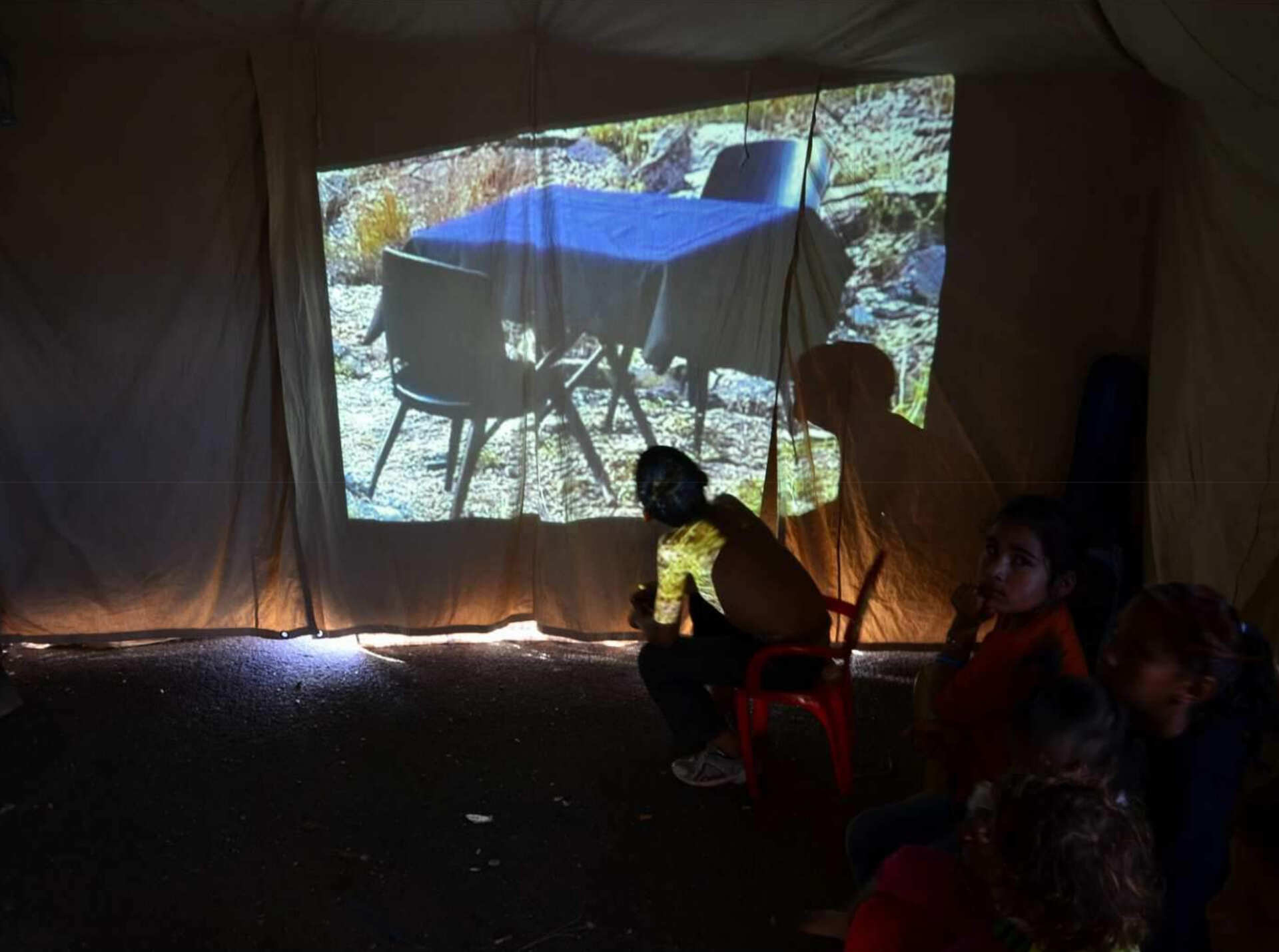 Notre tente est vidée pour se transformer en salle de projection foraine.