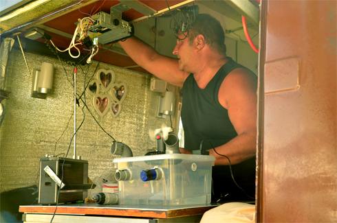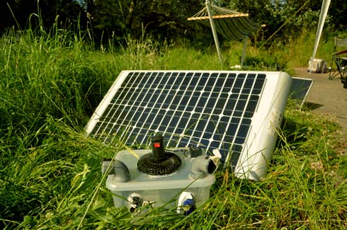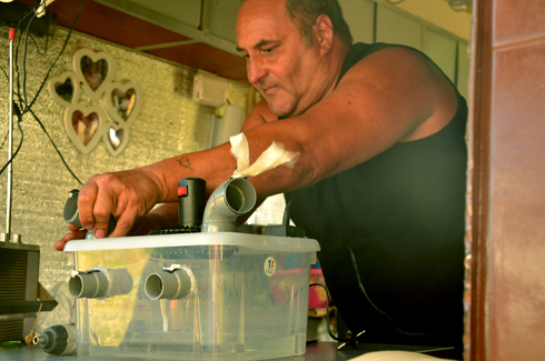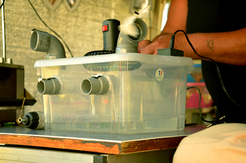 Une caisse en plastique, des tuyaux PVC rotatifs fixés au pistolet à colle et un petit ventilateur ; des glaçons sont placés dans le fond de la caisse permettant de rafraîchir l'air brassé par le ventilateur. « Tu peux mettre un peu d'huiles essentielles dans le fond, pour que ça sente bon ou encore pour repousser les moustiques ! », ajoute Marie-Christine. Jean-Charles nous fait une démonstration : « La glace tu la fais dans ton congélateur, tu la mets dedans-ça marche avec de l'eau fraîche aussi ! -, tu branches le ventilateur... en 12 Volts bien sûr ! Et voilà ! De l'air frais ! Tu peux aussi orienter les ouvertures et en boucher certaines... celles-là sont mieux en hauteur... ! »