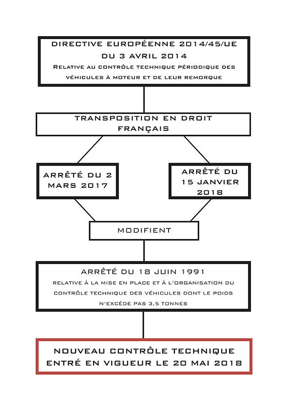 les arrêtés du 2 mars 20174 et du 15 janvier 20185 relatif à la mise en place et à l'organisation du contrôle technique des véhicules légers de moins de 3,5 tonnes assurent la transposition dans le droit français des objectifs fixés par la directive européenne.