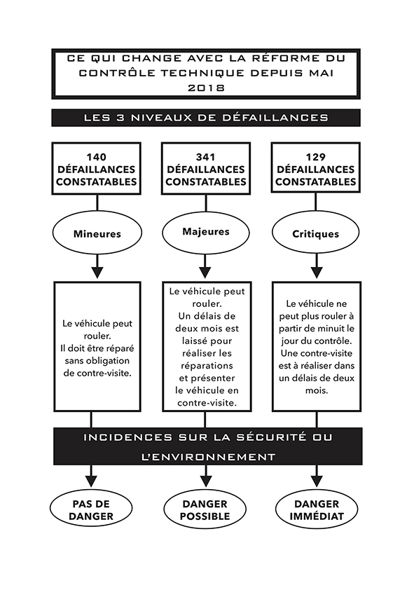 défaillance majeures (342) quant à elles sont susceptibles de compromettre la sécurité du véhicule, de mettre en danger les autres usagers, ou encore, ont un impact négatif sur l'environnement. Il sera donc nécessaire d'effectuer des réparations et de représenter son véhicule lors d'une contre-visite dans un délai de 2 mois. Il est cependant possible d'utiliser son véhicule pendant cette période. À l'inverse, si des