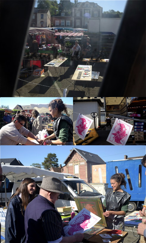 Dimanche Matin : atelier de sérigraphie et projection de films sur le marché de Brionne.