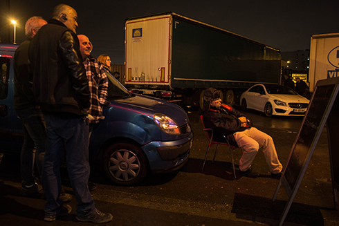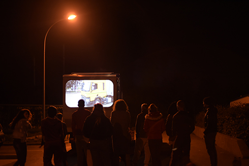 Jeudi 21 décembre, dernière soirée de projection dans la ville de Gennevilliers, où nous retrouvons Camel dans son restaurant « Au Rendez-vous des chauffeurs ». Nous avons eu la chance de voir publier un article annonçant l'événement dans le Parisien. Des affiches ont également été collées sur les murs et vitrines du lieu de projection. Les routiers rencontrés au cours de notre travail, et notamment ceux qui apparaissent dans le film ont été invités. Cependant, leur travail nomade ne leur a pas permis de se rendre à la projection ce soir là. Le film leur sera envoyé ultérieurement. Il est 19h, le restaurant commence à se remplir, routiers et autres travailleurs du coin se tiennent pour la plupart debout au bar, discutant les uns avec les autres. L'heure de la projection approche et nous les invitons à venir voir. Le MKN-VAN est garé le long de la terrasse du restaurant, au plus près des personnes présentes. Tables et chaises y sont installées, certains s'assoient, d'autres restent debout et débattent entre eux, analysant paroles et images. À la fin, nous discutons avec plusieurs groupes formés, du film, des vies des personnes et de leur travail pour en apprendre d'autant plus.